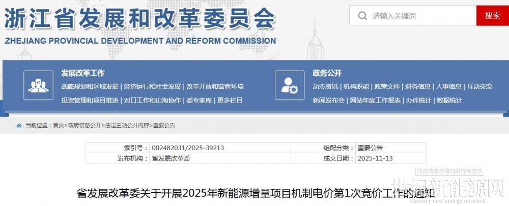 11月13日,浙江省发展改革委印发《关于开展2025年新能源增量项目机制电价第1次竞价工作的通知》。