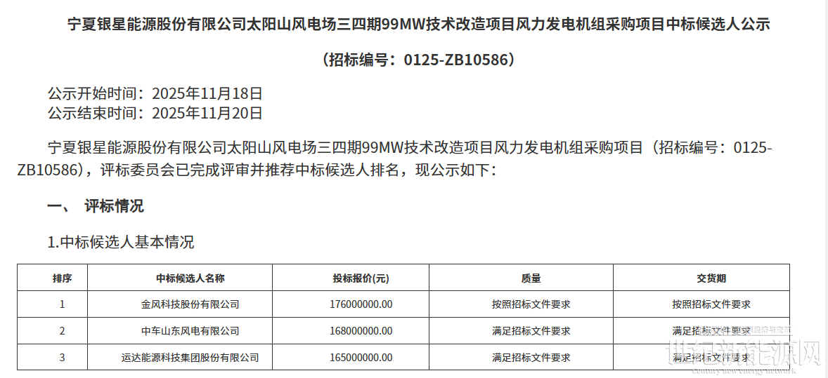 11月17日,宁夏银星能源股份有限公司太阳山风电场三四期99MW技术改造项目风力发电机组采购项目中标候选人公示。