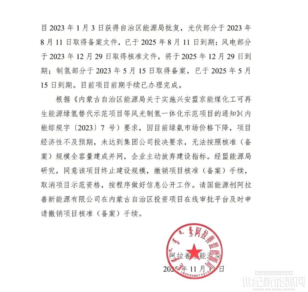 根据《内蒙古自治区能源局关于实施兴安盟京能煤化工可再生能源绿氢替代示范项目等风光制氢一体化示范项目的通知》(内能综规字〔2023〕7 号)要求,因目前绿氨市场价格下降,项目经济性不及预期,未达到集团公司投决要求,无法按照核准(备案)规模全容量建成并网,企业主动放弃建设指标。经盟能源局研究,同意该项目终止建设规模,撤销项目核准(备案)手续,取消项目示范资格,按程序做好信息公开工作。请国能源创阿拉善新能源有限公司在内蒙古自治区投资项目在线审批平台及时申请撤销项目核准(备案)手续。