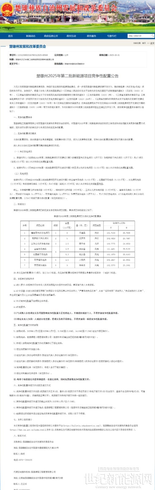 10月31日,云南省楚雄州2025年第二批新能源项目竞争性配置公告发布。