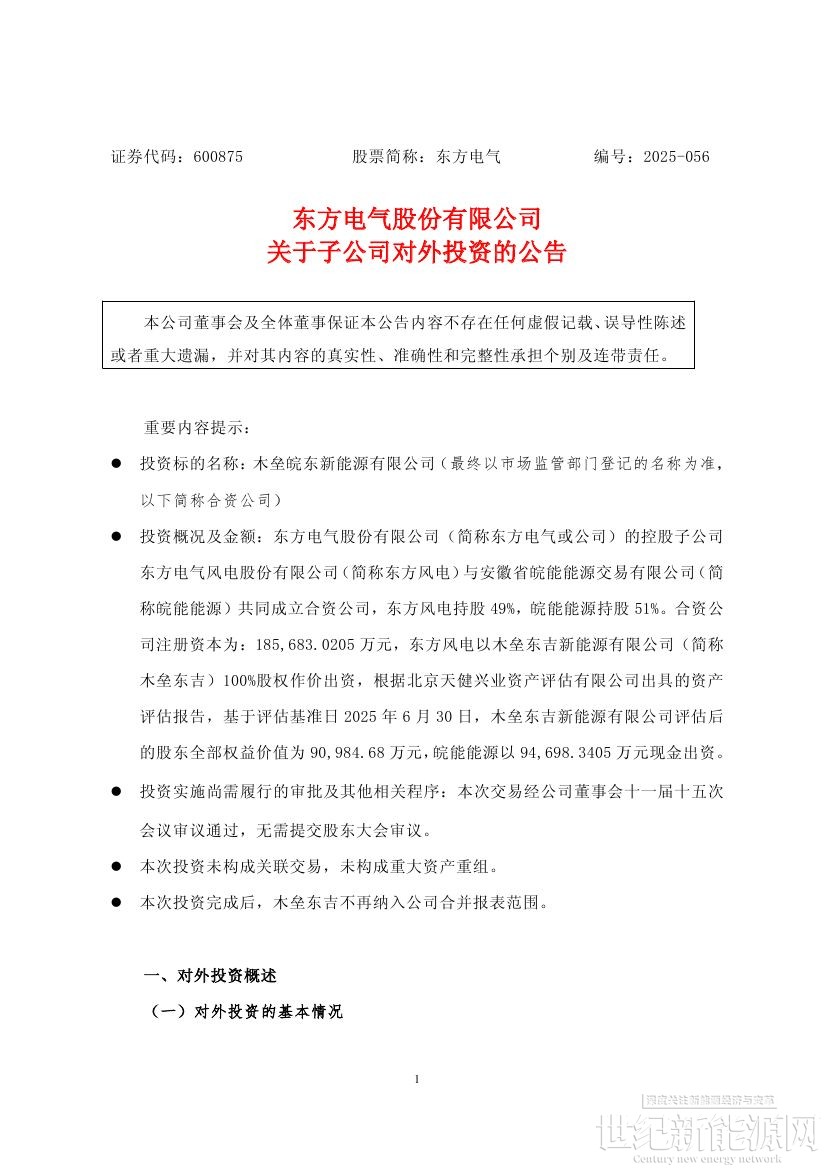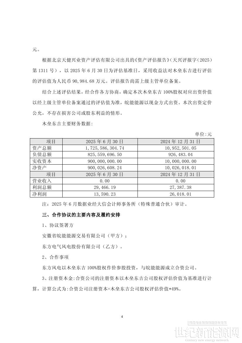 东方风电与皖能能源共同成立合资公司,注册资本185,683.0205万元。其中:东方风电以木垒东吉 100%股权作价出资,持股49%;皖能能源以94,698.3405万元现金出资,持股51%。皖能能源是安徽能源集团旗下公司,本次交易后将实际控制木垒东吉100万千瓦风电项目。