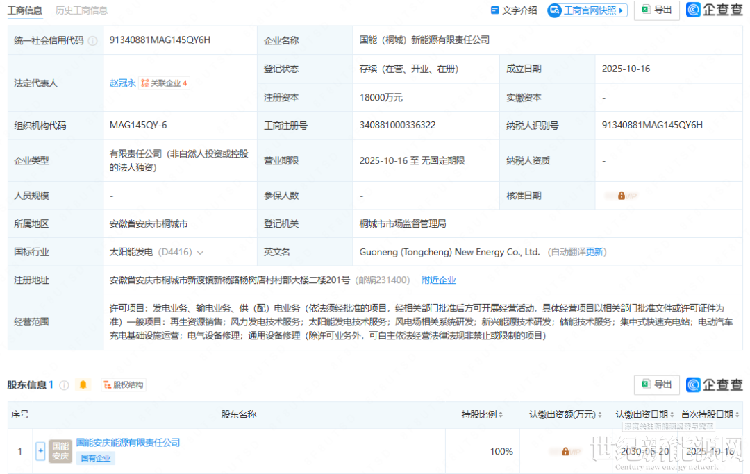 近日,国能(桐城)新能源有限责任公司成立,注册资本1.8亿元。股东及出资信息显示,该公司由国能安庆能源有限责任公司全资持股。
