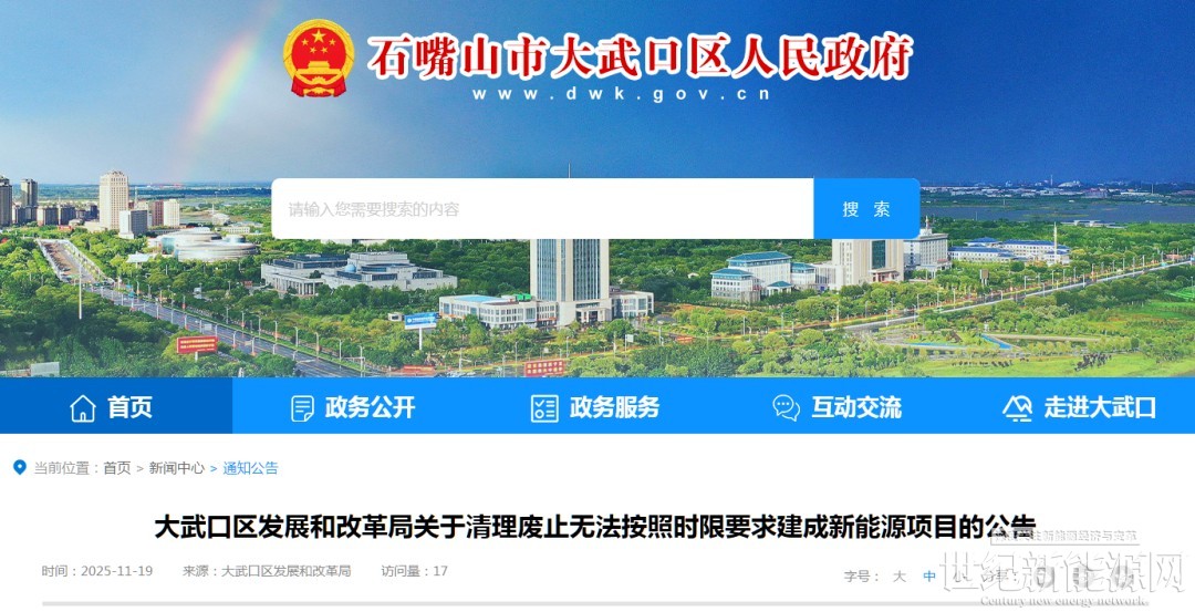 11月19日,宁夏大武口区发展和改革局发布《关于清理废止无法按照时限要求建成新能源项目的公告》。