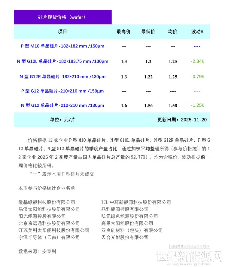 展望后市,终端需求偏弱、库存压力较大以及部分厂商低价出货,是硅片价格下行主要原因。短期看,硅片价格走势仍受上游多晶硅价格与下游电池片需求的双重影响。若后续各企业的减产计划能有效落实,同时终端市场需求明年一季度前迎来回暖,硅片供需关系有望得到改善,市场有望逐步企稳好转。