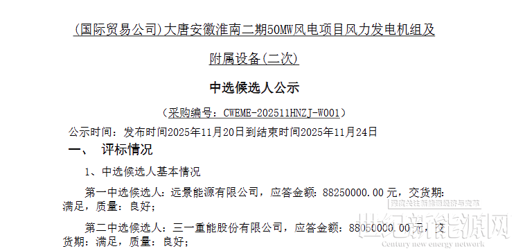 11月20日,大唐安徽淮南二期50MW风电项目风力发电机组及附属设备(二次)及大唐新疆乌鲁木齐县托里5万千瓦风电项目风力发电机组及附属设备(含塔筒)中标候选人公示。