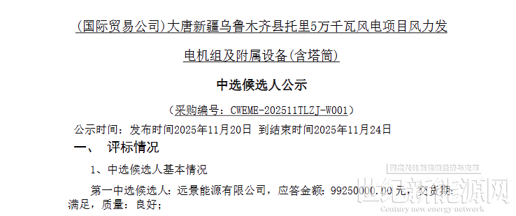 新疆乌鲁木齐县托里5万千瓦风电项目风力发电机组及附属设备(含塔筒):第一中选候选人远景能源,投标报价:9925万元。