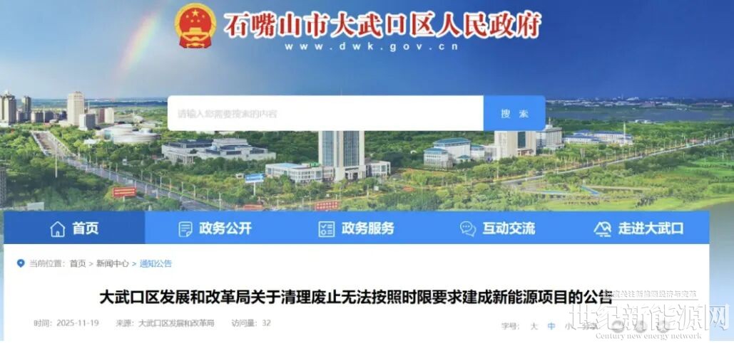 11月19日,宁夏回族自治区石嘴山市大武口区发展和改革局发布《关于清理废止无法按照时限要求建成新能源项目的公告》。