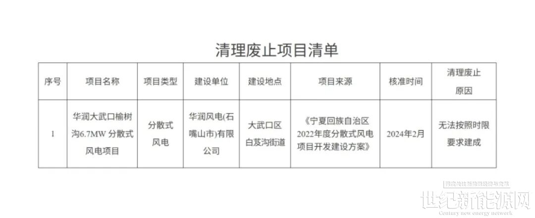 经梳理,华润大武口榆树沟6.7MW分散式风电项目(2022年度)仍未实质性开工建设,无法按照时限要求建成,按要求进行废止。