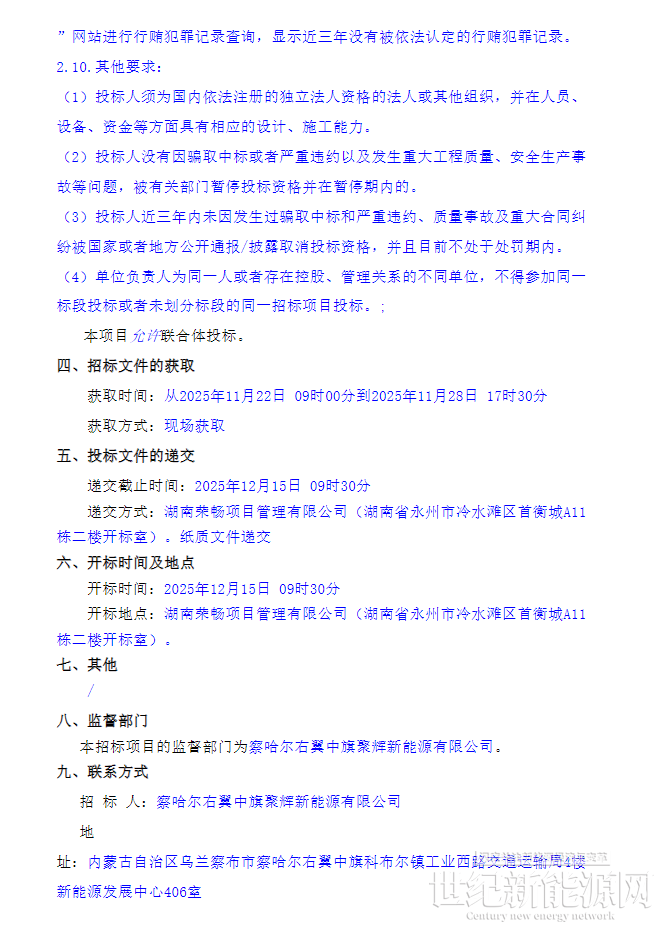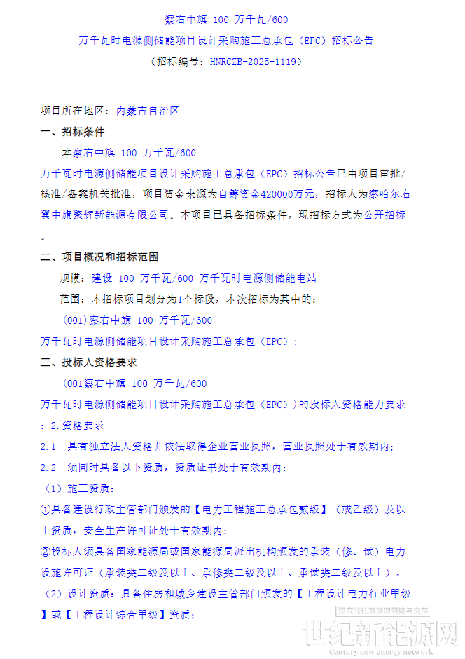 11月21日,察右中旗100万千瓦/600万千瓦时电源侧储能项目设计采购施工总承包(EPC)招标公告发布。该项目位于内蒙古自治区,由察哈尔右翼中旗聚辉新能源有限公司负责招标,项目资金为自筹资金420000万元,合0.7元/Wh。