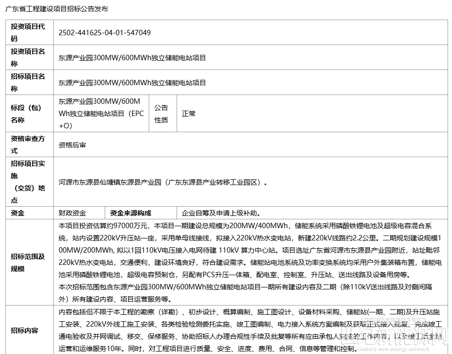 本次招标范围包含东源产业园300MW/600MWh独立储能电站项目一期所有建设内容及二期(除110kV送出线路及对侧间隔外)所有建设内容、项目运营服务等。
