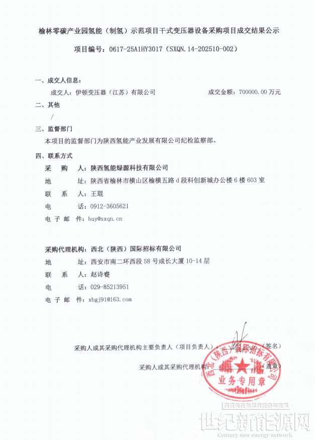 11月21日,榆林零碳产业园氢能(制氢)示范项目干式变压器设备采购项目成交结果公示。