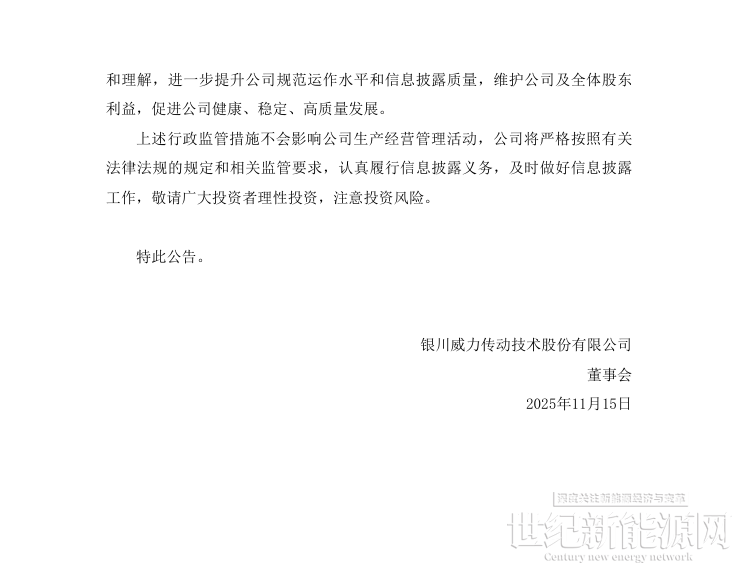 近日,银川威力传动技术股份有限公司(以下简称“威力传动”或“公司”)发布《关于收到中国证券监督管理委员会宁夏监管局行政监管措施决定书的公告》。