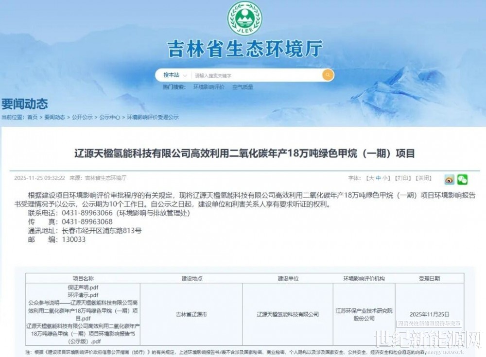 根据公示,辽源天楹氢能科技有限公司高效利用二氧化碳年产18万吨绿色甲烷(一期)项目位于辽源高新技术产业开发区化工产业园区内,为“风光储氢氨醇一体化”系列项目中的绿氢、绿色甲烷生产部分。