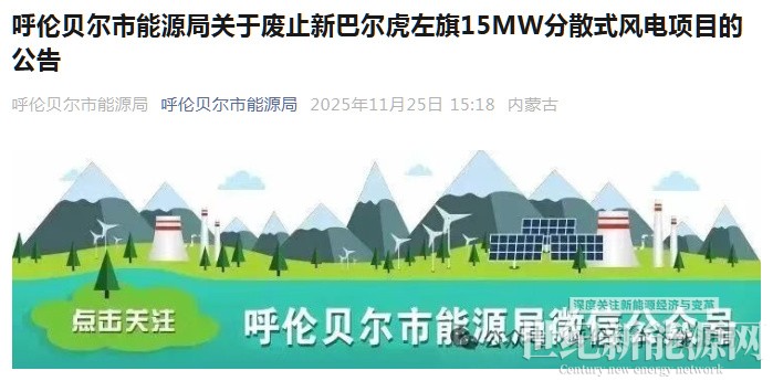 11月25日,内蒙古呼伦贝尔市能源局发布关于废止新巴尔虎左旗15MW分散式风电项目的公告。