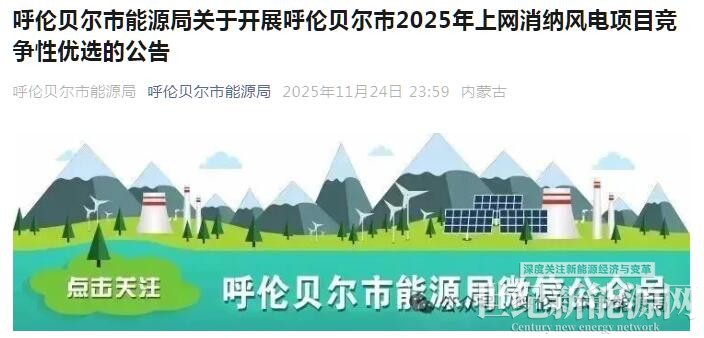 11月24日,内蒙古呼伦贝尔市能源局发布关于开展呼伦贝尔市2025年上网消纳风电项目竞争性优选的公告。