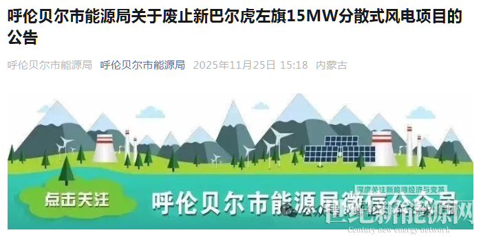 11月25日,内蒙古呼伦贝尔市能源局发布关于废止新巴尔虎左旗15MW分散式风电项目的公告。