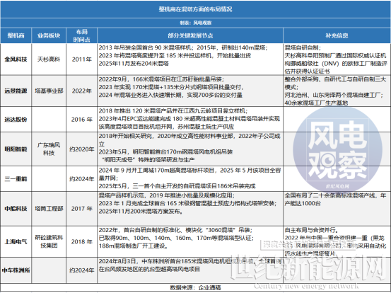 后发企业也有亮眼表现,如远景能源在混塔布局上直接瞄准了180米以上超高塔,2022年着手混塔业务,至今已实现样机竖立、小批量应用、批量化并网。据业内媒体报道,其市场增速保持全行业第一的同时,已交付的1700台混塔零重大失效。