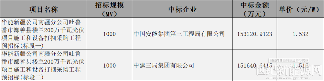 11月25日,中国华能电子商务平台发布华能新疆公司南疆分公司吐鲁番市鄯善县楼兰200万千瓦光伏项目施工和设备打捆采购工程预招标中标结果公示,中标人分别为中国安能集团第三工程局有限公司、中建三局集团有限公司,单价分别为1.532元/W、1.516元/W。