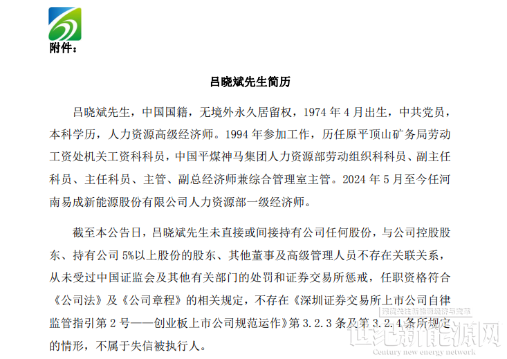 吕晓斌先生,中国国籍,无境外永久居留权,1974年4月出生,中共党员,本科学历,人力资源高级经济师。1994年参加工作,历任原平顶山矿务局劳动工资处机关工资科科员,中国平煤神马集团人力资源部劳动组织科科员、副主任科员、主任科员、主管、副总经济师兼综合管理室主管。2024年5月至今任河南易成新能源股份有限公司人力资源部一级经济师。