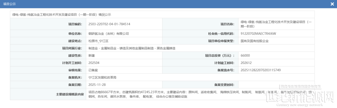11月28日,吉林省投资项目在线审批监管平台显示,绿电-绿氢-纯氢冶金工程化技术开发及建设项目(一期一阶段)完成。