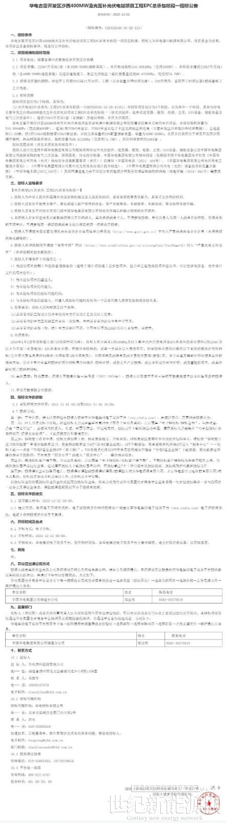 12月1日,华电古雷开发区沙西400MW渔光互补光伏电站项目工程EPC总承包招标公告。