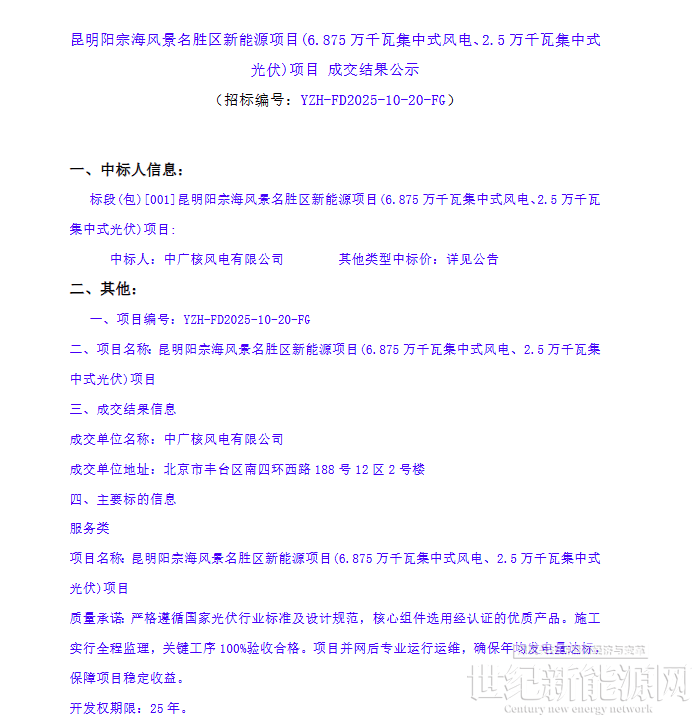 11月27日,云南昆明阳宗海风景名胜区新能源项目(6.875万千瓦集中式风电、2.5万千瓦集中式光伏)项目中标候选人公示。根据公示,中标人为中广核风电有限公司。