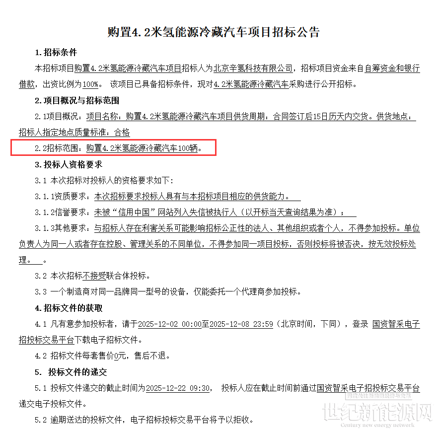 项目采购100台4.2米氢能源冷藏汽车,采购人为北京辛氢科技有限公司。