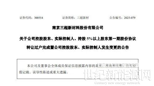 近日,三超新材(300554.SZ)发布控股股东变更完成过户的公告,无锡博达合一科技有限公司(下称“博达合一”)正式成为公司控股股东,“80后”无锡富豪柳敬麒接任实际控制人。