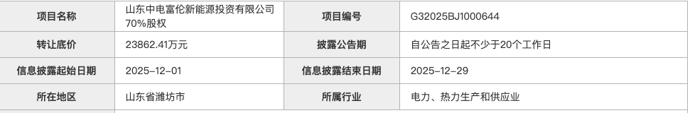 据北京产权交易所消息:央企子公司中国电子系统技术有限公司转让其持有的山东中电富伦新能源投资有限公司70%股权,也就是其所持有该公司的所有股权,转让23862.41万元。