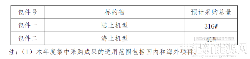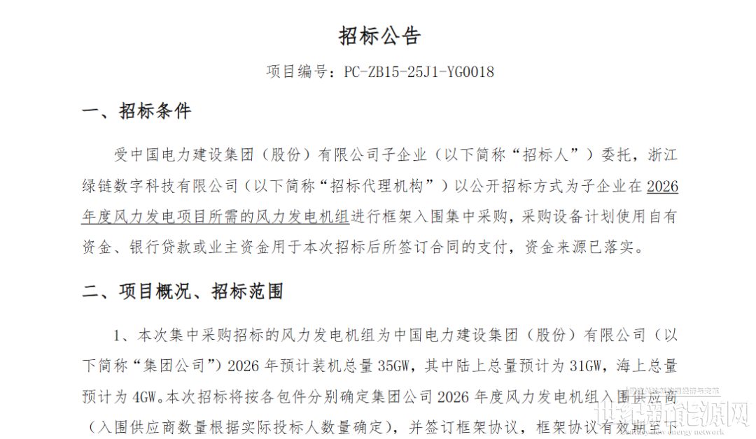 公告显示,本次集中采购招标的风力发电机组为中国电力建设集团(股份)有限公司(以下简称“集团公司”)2026年预计装机总量35GW,其中陆上总量预计为31GW,海上总量预计为4GW。本次招标将按各包件分别确定集团公司2026年度风力发电机组入围供应商(入围供应商数量根据实际投标人数量确定),并签订框架协议,框架协议有效期至下一年度集中采购结果正式公布为止。