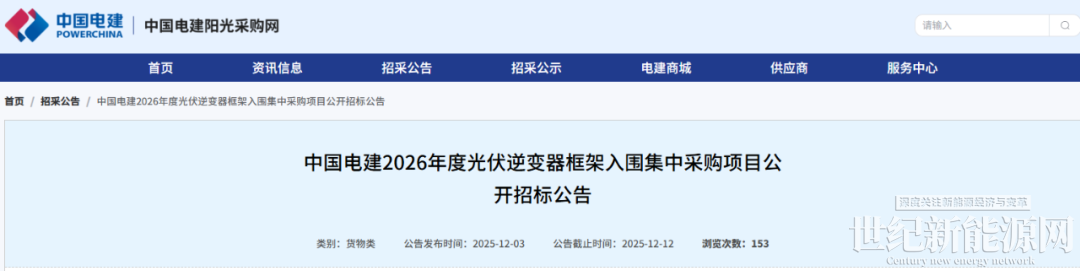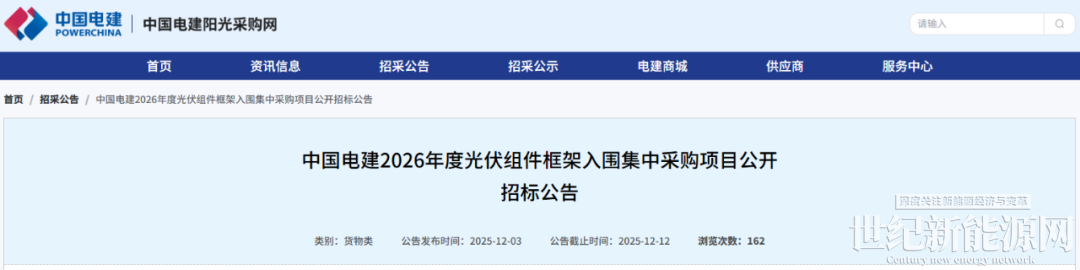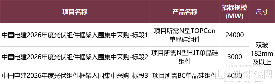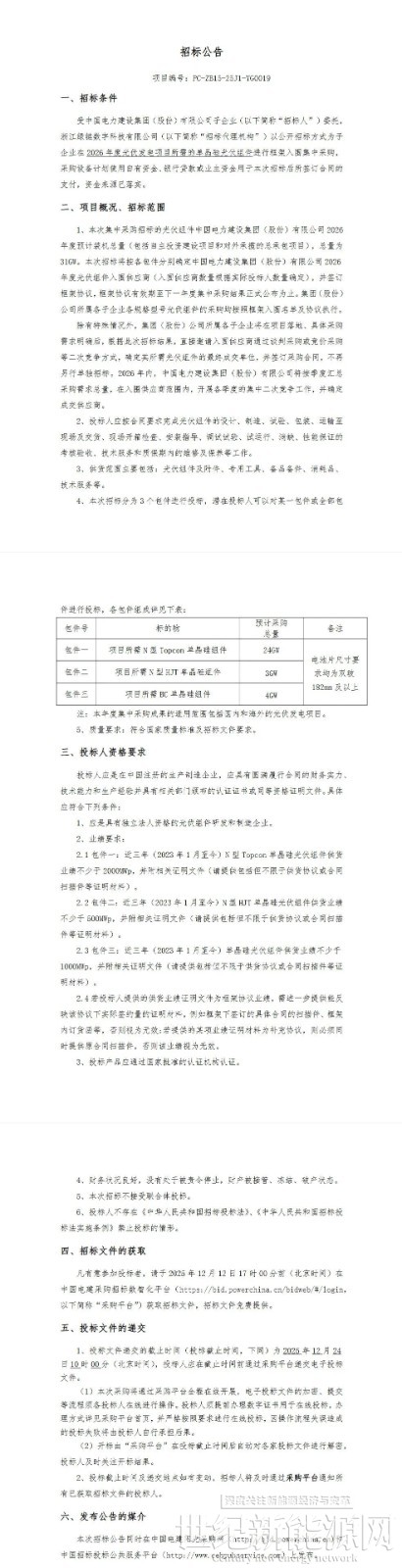 从中国电建阳光采购网官网获悉,12月3日,中国电建2026年度光伏组件框架入围集中采购项目公开招标公告发布,本次招标分为3个包件,采购TOPCon、HJT、BC组件,共计31GW,详情如下: