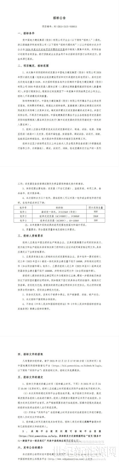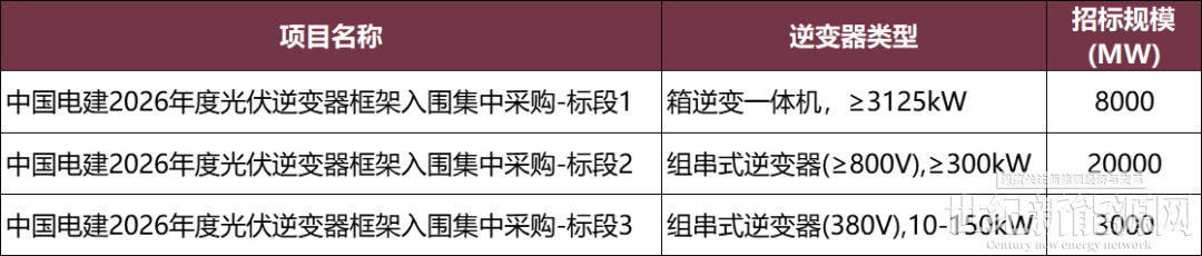 同日,中国电建2026年度光伏逆变器框架入围集中采购发布,招标公告显示,采购箱逆变一体机、组串式逆变器,总规模达到31GW,分三个包件,详情如下:
