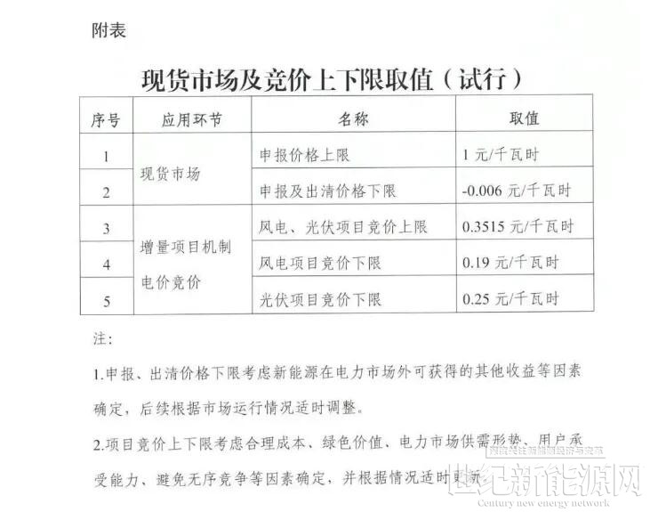 同时,适当放宽现货市场限价。贵州省增量新能源项目机制电价竞价上下限分别为:风电:0.19~0.3515元/kWh;光伏:0.25~0.3515元/kWh。