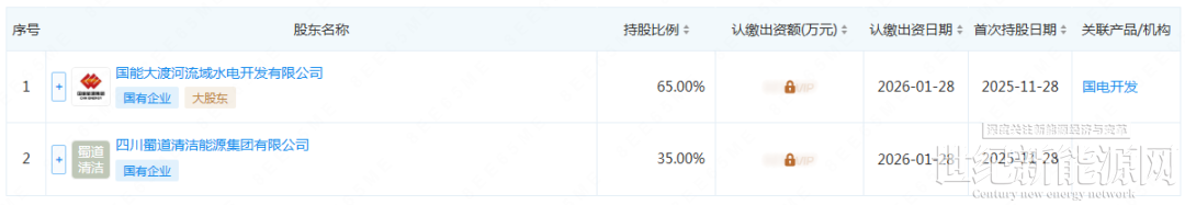 企查查股权穿透显示,该公司由国能大渡河流域水电开发有限公司、四川蜀道清洁能源集团有限公司共同持股。