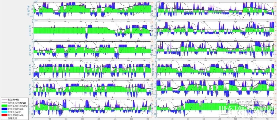 仅在7月中下旬出现储氢罐完全放空且无足够新能源发电制氢的极端情况。为此,根据模拟结果,另外设置5个1.5MPa,2000标方水容积低压气态球形储氢罐作为长时缓存措施,储存能力14万标方,可满足合成氨50%负荷工况下10h运行需求,避免合成氨装置停车造成经济损失。
