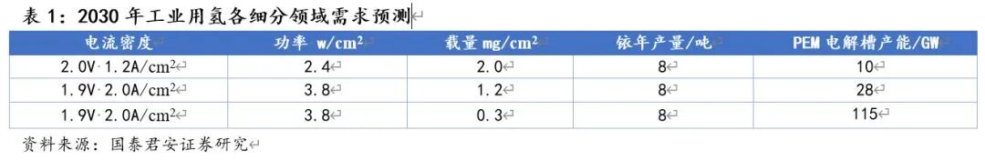 目前我国PEM产品并不成熟,成本保持在碱性电解槽的5-8倍,制氢功率电流密度和寿命等核心指标还未达到先进程度。目前国内厂商电流密度为1-1.2A/cm2,海外成熟厂商电流密度为2A/cm2;根据美国DOE目标,到2030年电流密度可提升至2.5-3A/cm2。参考海外成熟PEM厂商材料成本及用量,根据测算,电流密度从1A/cm2提升至2A/cm2,成本降低50%,提升至3A/cm2,成本降低67%。目前国内贵金属催化剂铱载量为2-4mg/cm2,海外成熟厂商贵金属催化剂铱载量为1.2mg/cm2;根据美国DOE目标,到2030年铱载量0.3mg/cm2。目前,铱年产量7-9吨(铱是铂的伴生矿,且高度集中于南非,铂年产量200吨左右,铱/铂的伴生比例1/25),按电解电压1.9V、电流密度2A/cm2,铱载量1.2mg/cm2可满足PEM电解槽年产能28GW,铱载量0.3mg/cm2可满足PEM年出货量115GW。