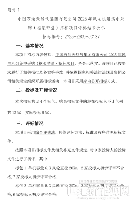 12月5日,中石油2025年风电机组集中采购(框架带量)招标项目评标结果公示。