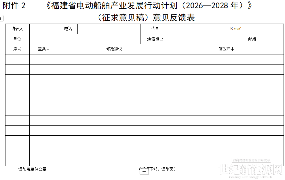 巩固提升我省电动船舶全产业链优势,加快形成电动船舶及核心装备谱系化供给能力,推动我省电动船舶产业迈向更高水平。我厅起草了《福建省电动船舶产业发展行动计划(2026—2028年)》(征求意见稿,详见附件1),现向社会公开征求意见,欢迎您填写《意见反馈表》(见附件2)提出宝贵意见及建议。