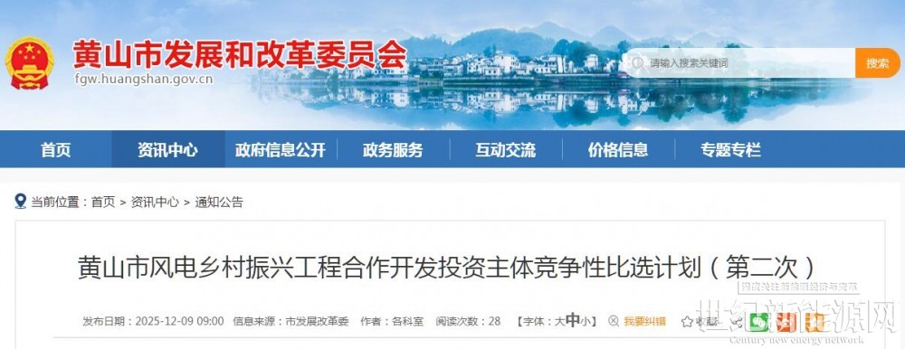 12月9日,黄山市发展和改革委员会发布黄山市风电乡村振兴工程合作开发投资主体竞争性比选计划(第二次)。