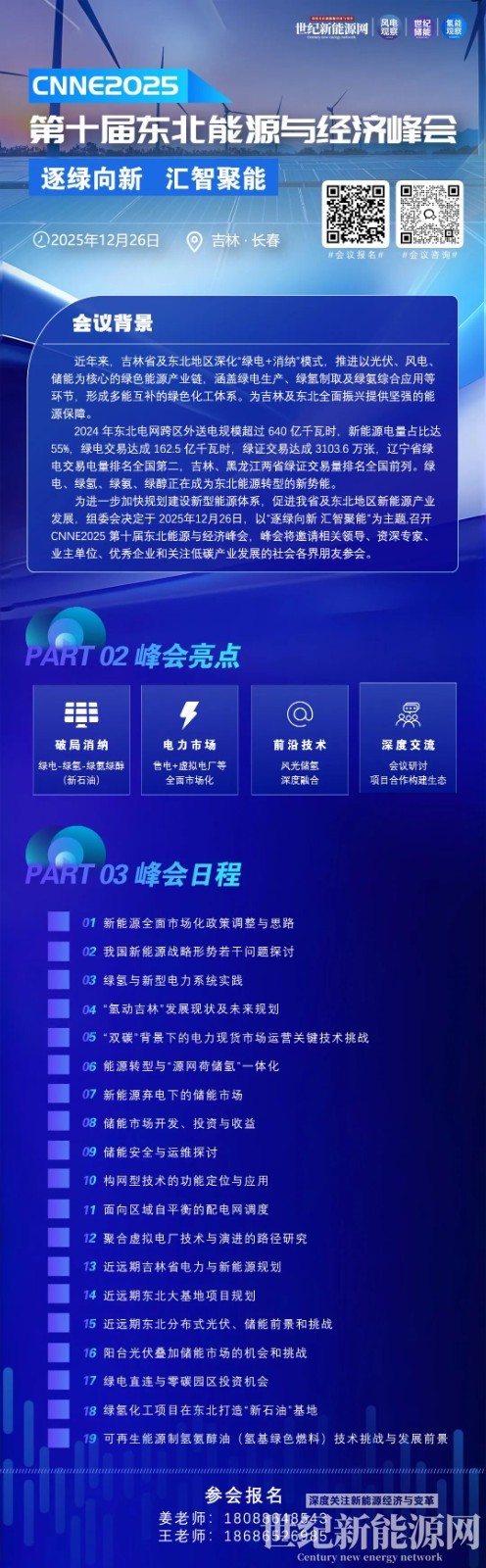 为进一步加快规划建设新型能源体系,促进吉林省及东北地区新能源产业发展,组委会决定于2025年12月26日,以“逐绿向新 汇智聚能"为主题,召开CNNE2025第十届东北能源与经济峰会,峰会将邀请相关领导、资深专家、业主单位、优秀企业和关注低碳产业发展的社会各界朋友参会。