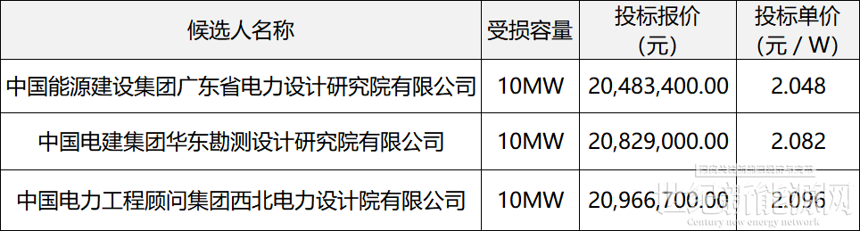 中标候选人:中国能源建设集团广东省电力设计研究院有限公司,投标报价:20483400.00元;中标候选人:中国电建集团华东勘测设计研究院有限公司,投标报价:20829000.00元;中标候选人:中国电力工程顾问集团西北电力设计院有限公司,投标报价:20966700.00元。
