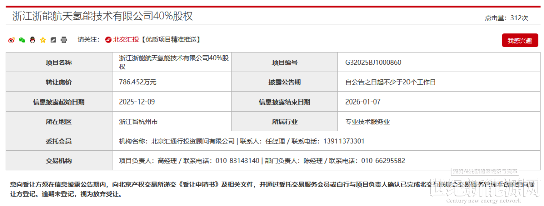 12月9日,北京产权交易所发布浙江浙能航天氢能技术有限公司40%股权转让公告。转让底价786.452万元。