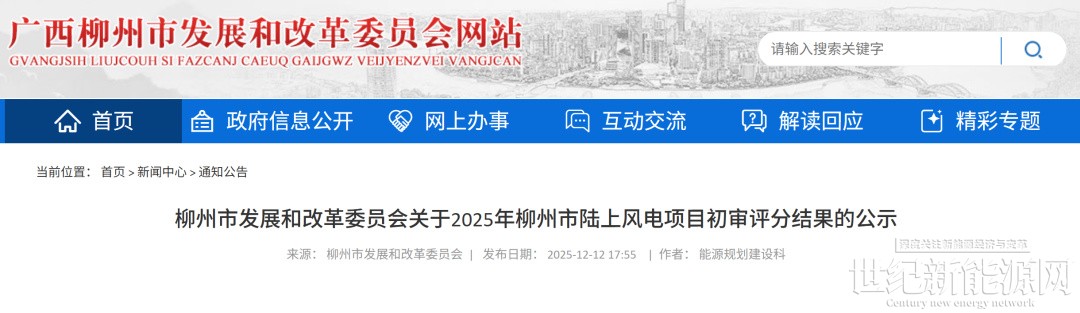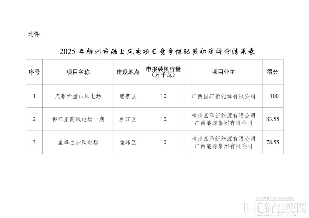 柳州市发展和改革委员会关于2025年柳州市陆上风电项目初审评分结果的公示根据《广西壮族自治区能源局关于做好2025年新能源项目回收指标再分配的通知》(桂能新能〔2025〕470号)有关要求,我委组织开展2025年柳州市陆上风电项目申报并会同相关部门开展竞争性配置初审评分工作。现将评分结果予以公示,公示期间,如有异议,请在公示发布之日起3日内以书面形式向我委反映(信函以到达日期邮戳为准)。联系人:能源规划建设科联系电话:0772-2660422邮寄地址:广西柳州市文昌路66号文昌综合楼邮编:545200附件:2025年柳州市陆上风电项目竞争性配置初审评分结果表柳州市发展和改革委员会2025年12月12日