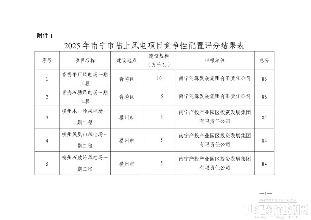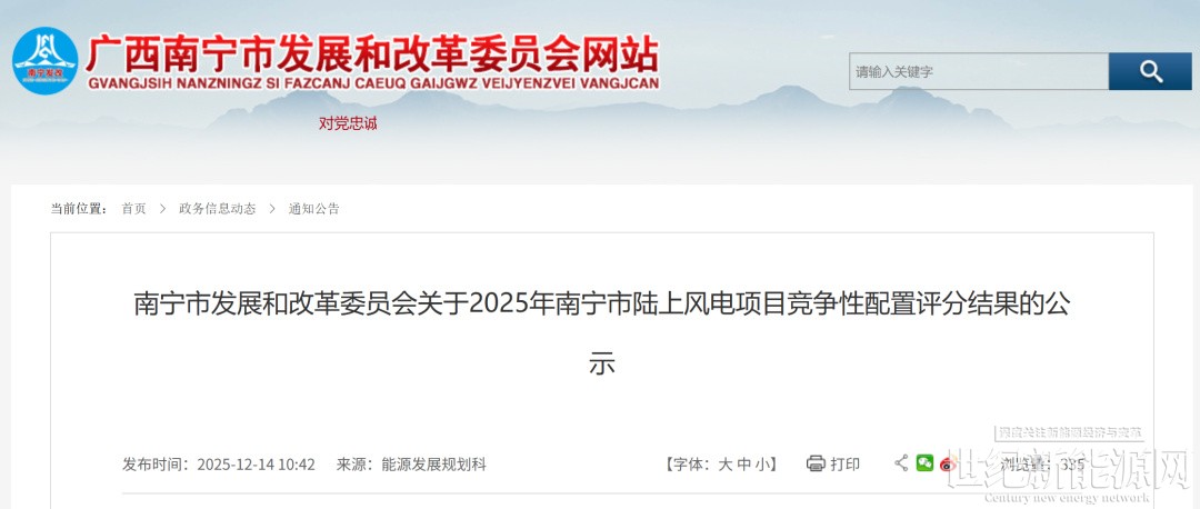 南宁市发展和改革委员会关于2025年南宁市陆上风电项目竞争性配置评分结果的公示根据《广西壮族自治区能源局关于做好2025年新能源项目回收指标再分配的通知》(桂能新能〔2025〕470号)有关要求,我委组织开展2025年南宁市陆上风电项目竞争性配置工作,经项目申报、第三方机构审核、专家评分等程序,形成《2025年南宁市陆上风电项目竞争性配置评分结果表》,现予以公示。公示期间,如有异议,请在公示发布之日起3个工作日内以书面形式向我委反映(信函以到达日期邮戳为准)。联系人:吴宇康联系电话:0771-5583512传真电话:0771-5539215邮寄地址:广西壮族自治区南宁市青秀区桂春路南一里1号附件:2025年南宁市陆上风电项目竞争性配置评分结果表2025年12月14日