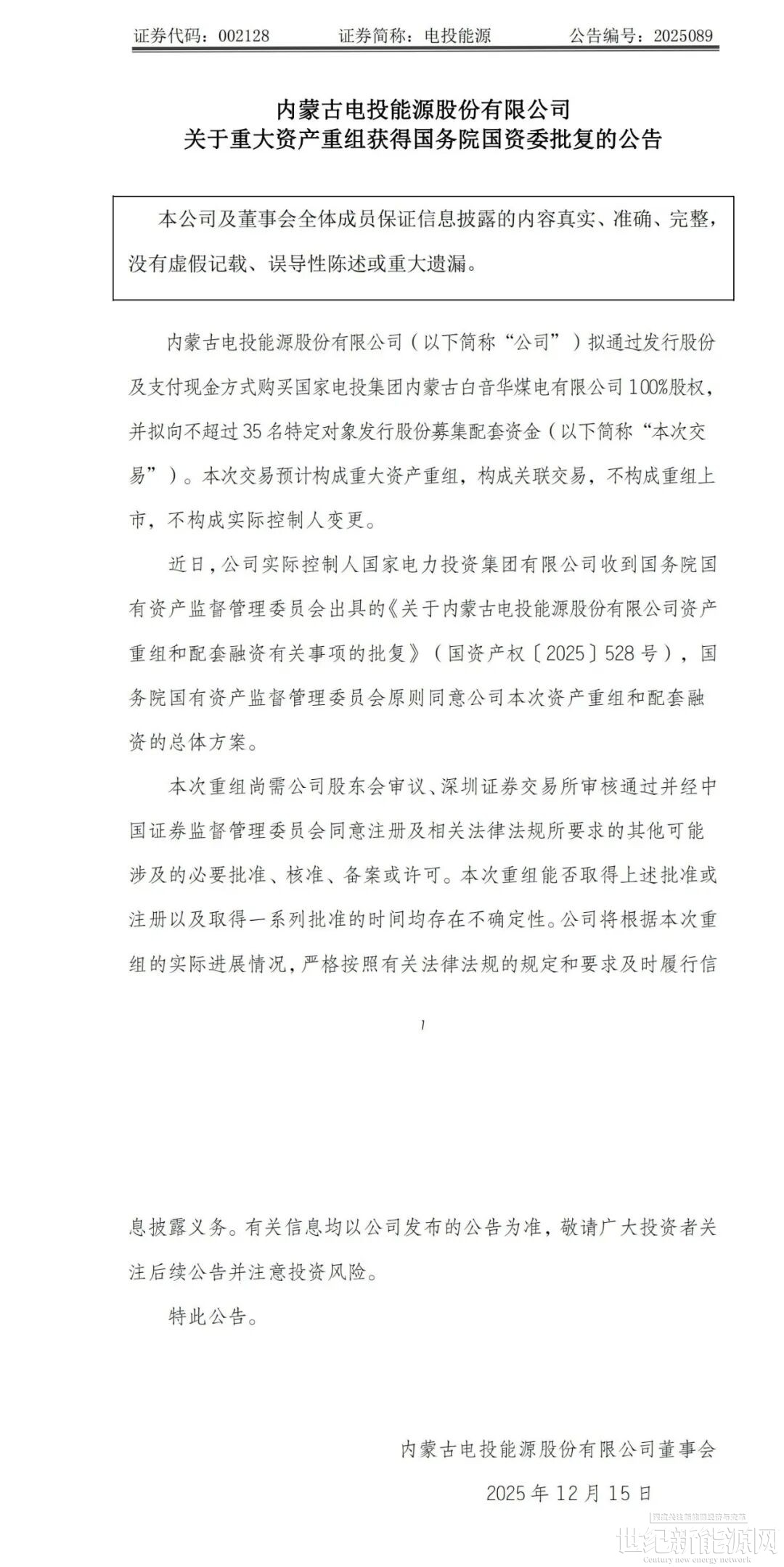 12月15日,电投能源发布公告称,内蒙古电投能源股份有限公司拟通过发行股份及支付现金方式购买国家电投集团内蒙古白音华煤电有限公司100%股权,并拟向不超过35名特定对象发行股份募集配套资金。本次交易预计构成重大资产重组,构成关联交易,不构成重组上市,不构成实际控制人变更。