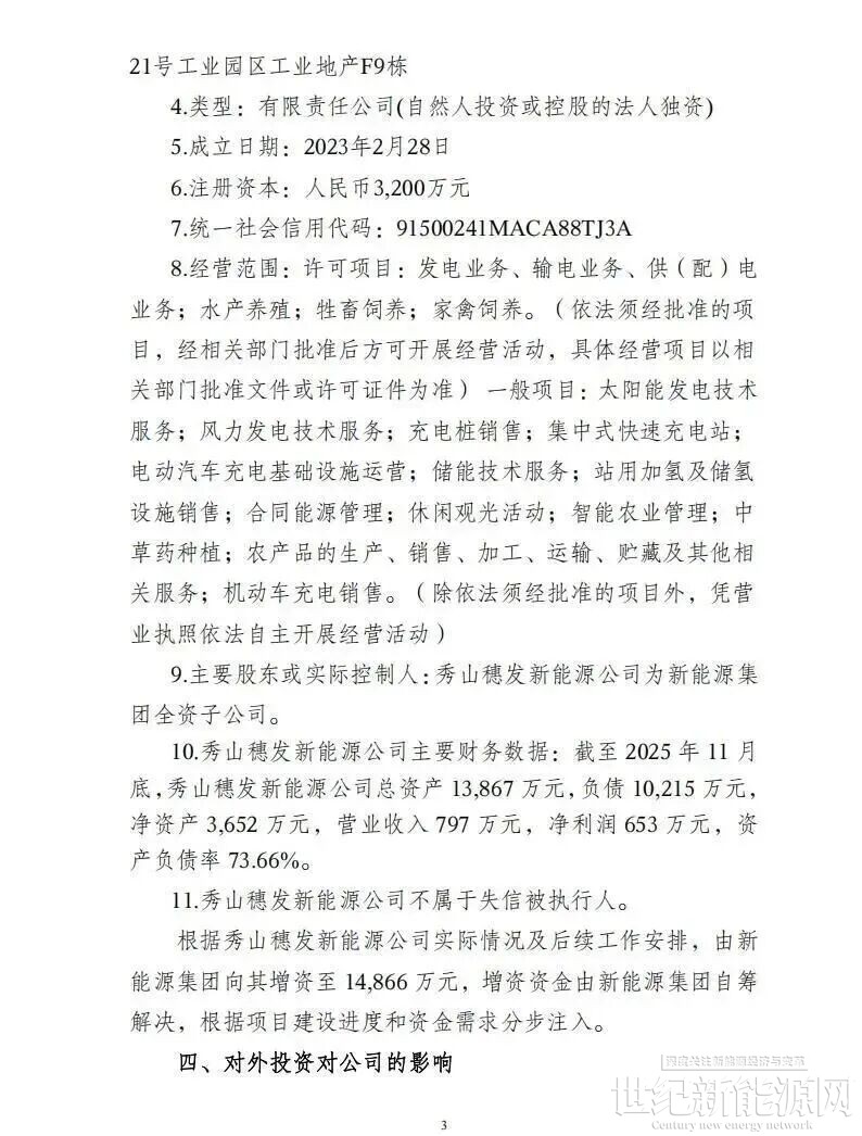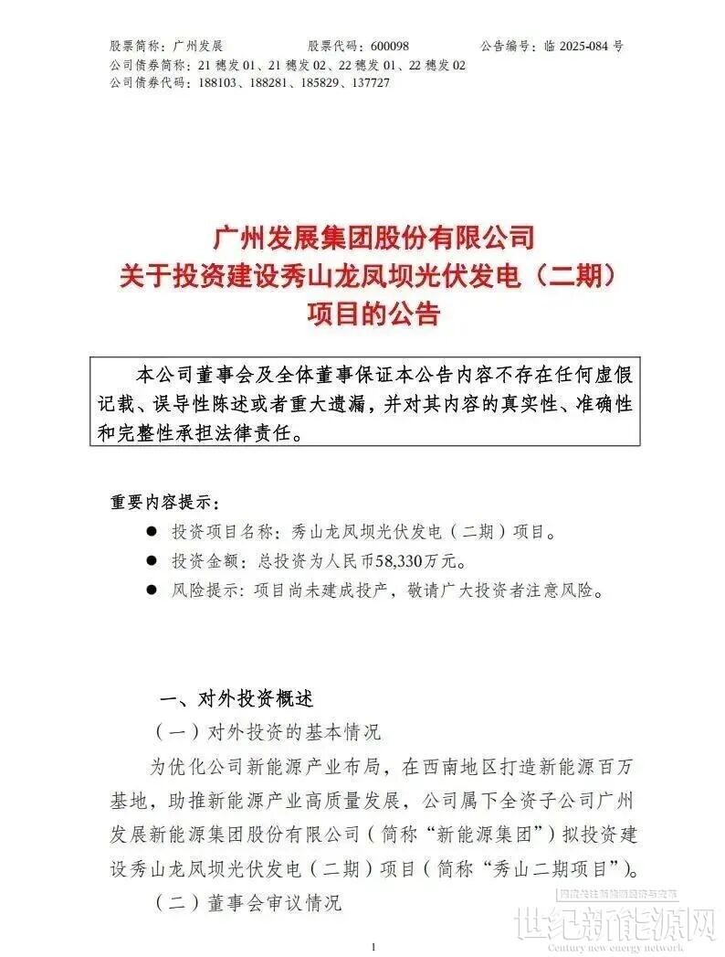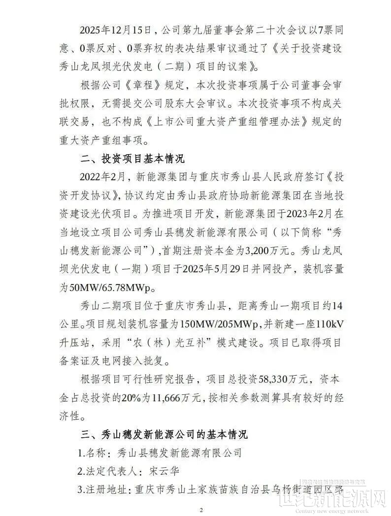 此前,新能源集团已于2023年2月设立项目公司秀山县穗发新能源有限公司,其一期项目(50MW/65.78MWp)已于2025年5月并网投产。