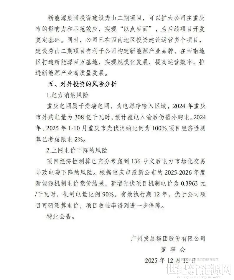 项目经济性测算已充分考虑到136号文后电力市场化交易导致电费下降的风险。根据重庆市最新公布的2025-2026年度新能源机制电价竞价结果,新增光伏项目机制电价为0.3963元/千瓦时,机制电量比例90%,有效执行期12年,优于公司项目可研测算电价,项目收益率得到进一步保障。