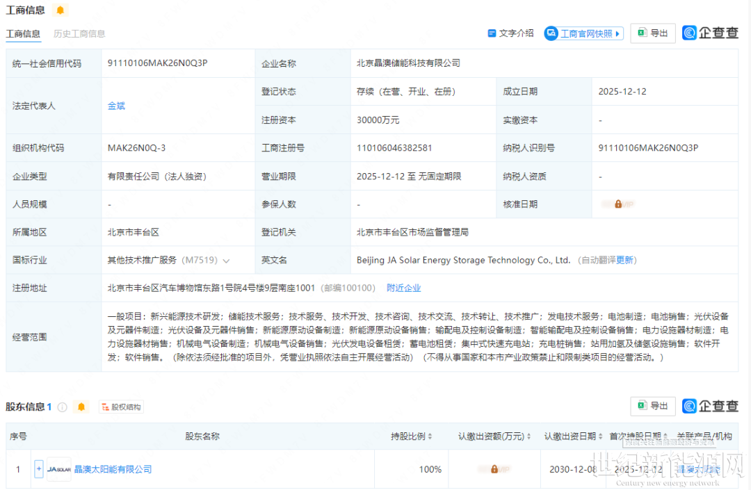近日,北京晶澳储能科技有限公司成立,注册资本3亿人民币。经营范围包括新兴能源技术研发、储能技术服务、新能源原动设备制造、新能源原动设备销售等。