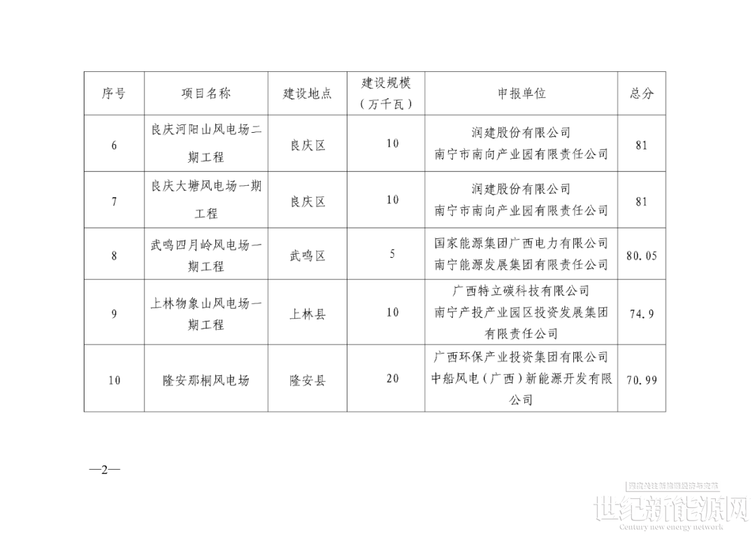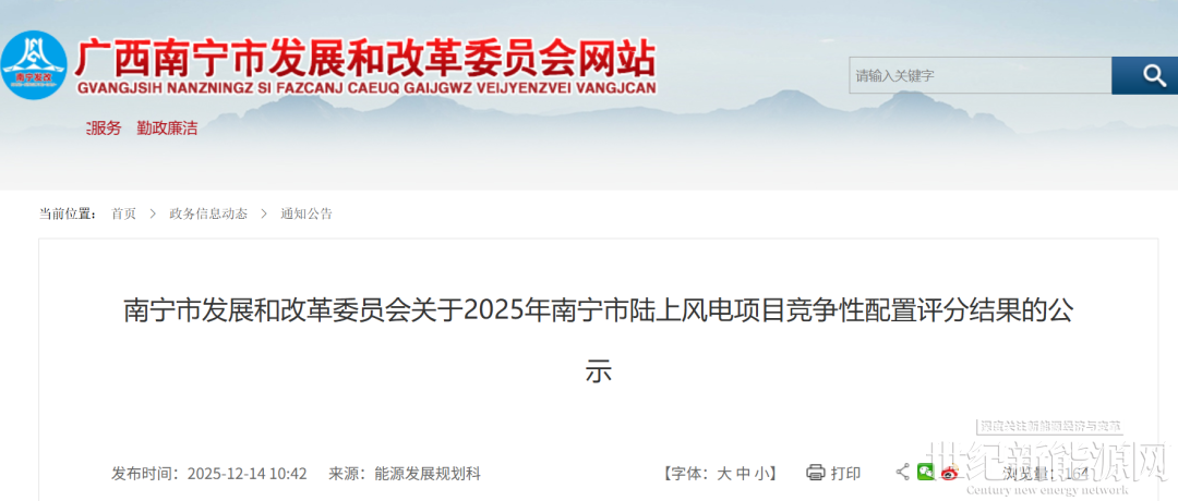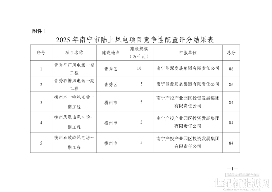 根据《广西壮族自治区能源局关于做好2025年新能源项目回收指标再分配的通知》(桂能新能〔2025〕470号)有关要求,我委组织开展2025年南宁市陆上风电项目竞争性配置工作,经项目申报、第三方机构审核、专家评分等程序,形成《2025年南宁市陆上风电项目竞争性配置评分结果表》,现予以公示。公示期间,如有异议,请在公示发布之日起3个工作日内以书面形式向我委反映(信函以到达日期邮戳为准)。