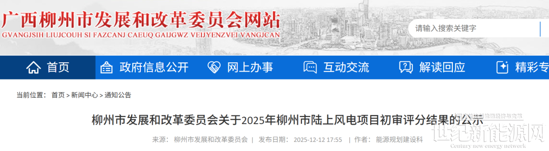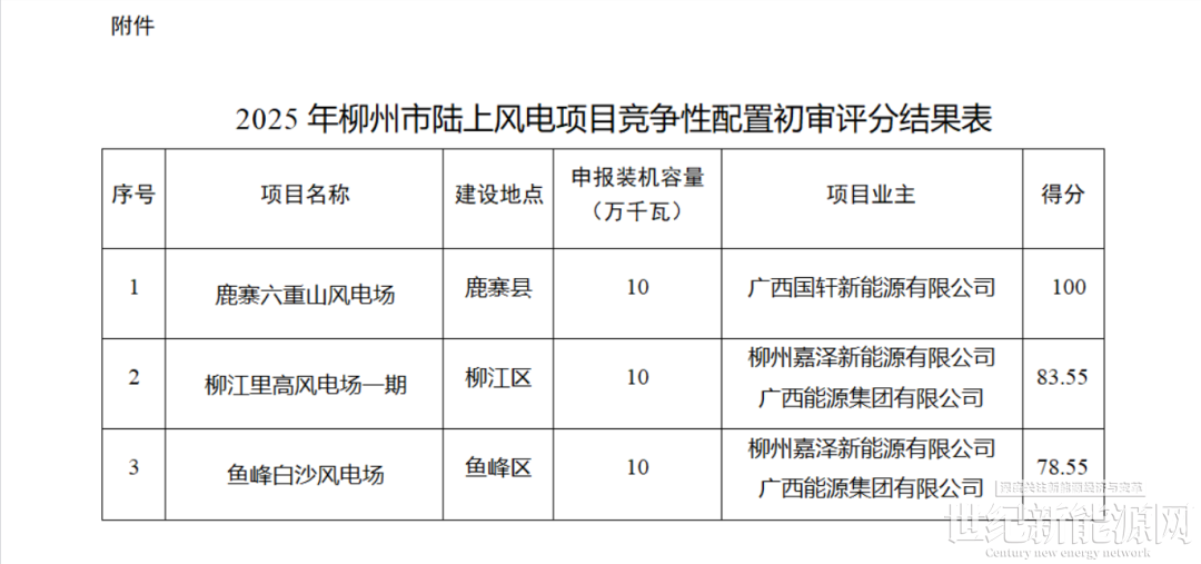 根据《广西壮族自治区能源局关于做好2025年新能源项目回收指标再分配的通知》(桂能新能〔2025〕470号)有关要求,我委组织开展2025年柳州市陆上风电项目申报并会同相关部门开展竞争性配置初审评分工作。现将评分结果予以公示,公示期间,如有异议,请在公示发布之日起3日内以书面形式向我委反映(信函以到达日期邮戳为准)。